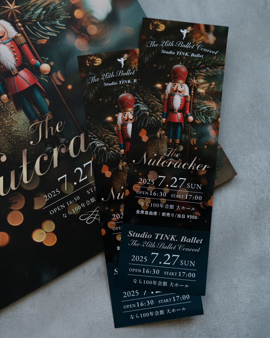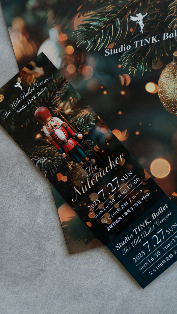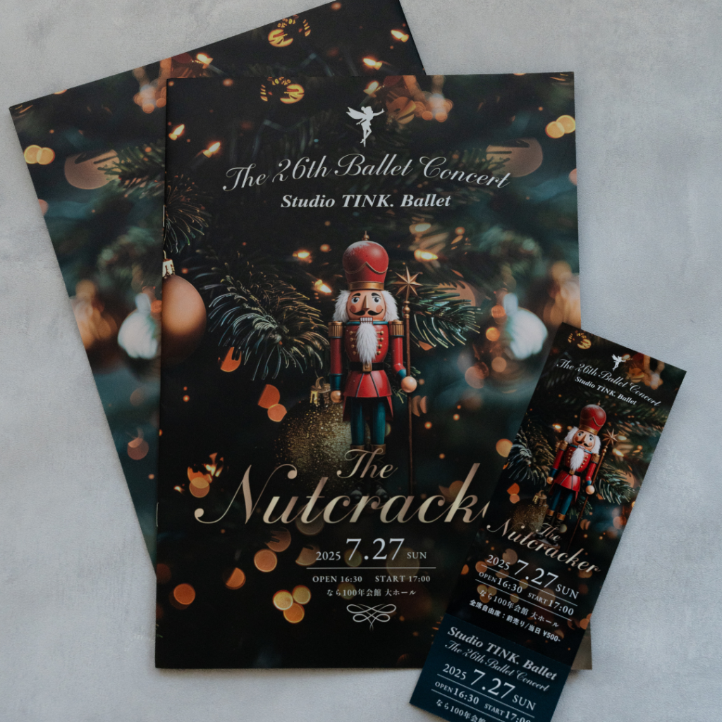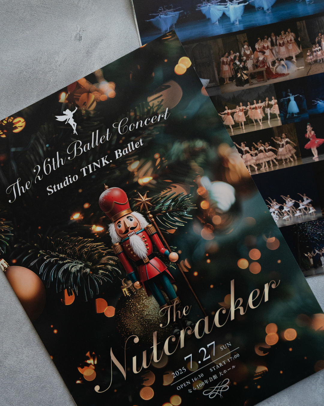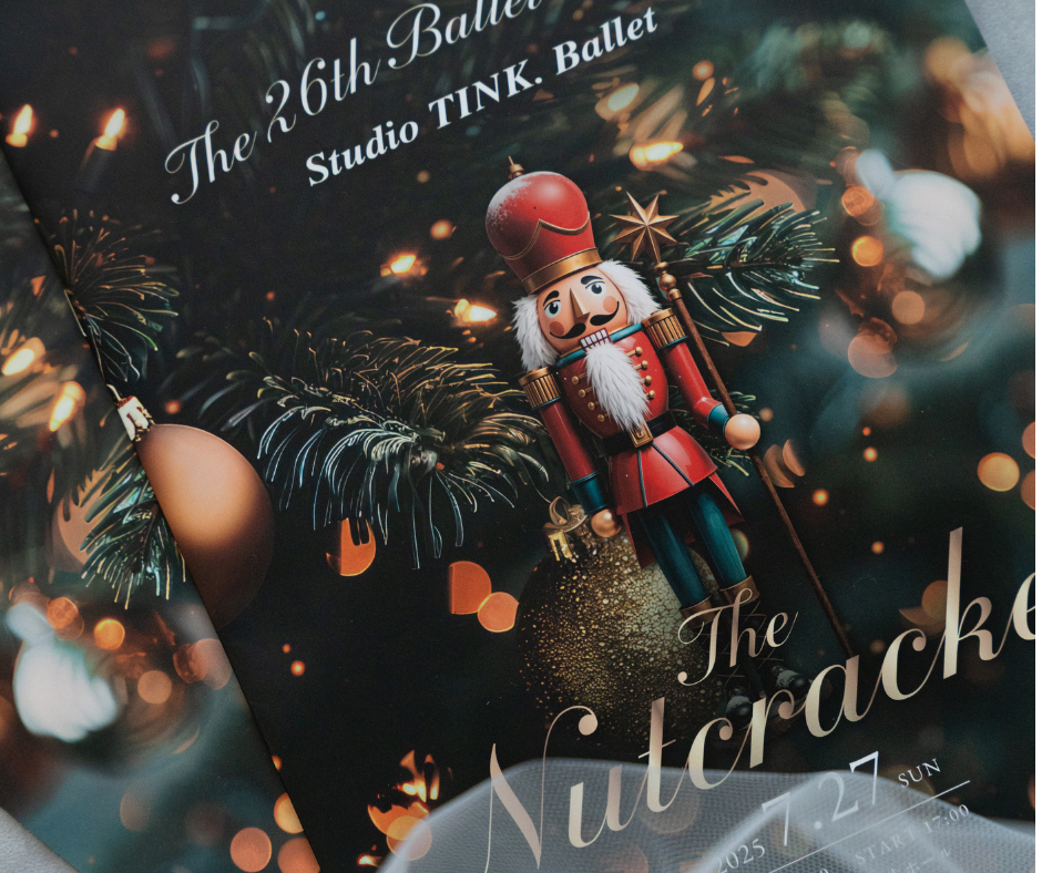 “The Nutcracker”のタイトルもツリーのオーナメントのような輝き溢れるゴールドをあしらっています。