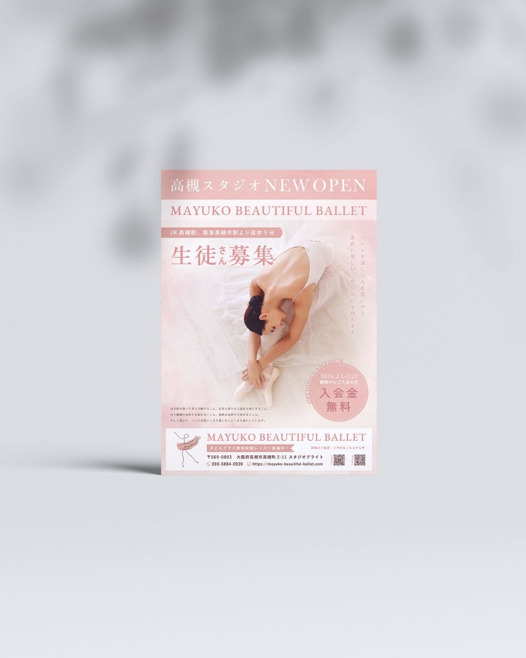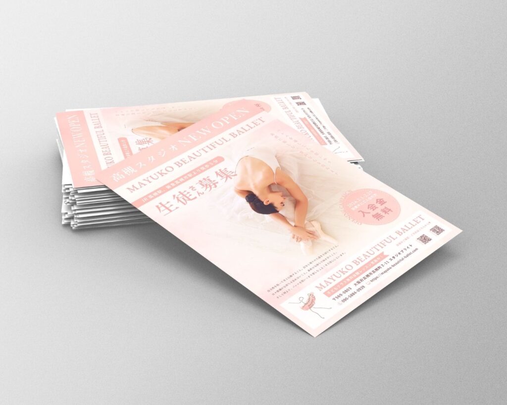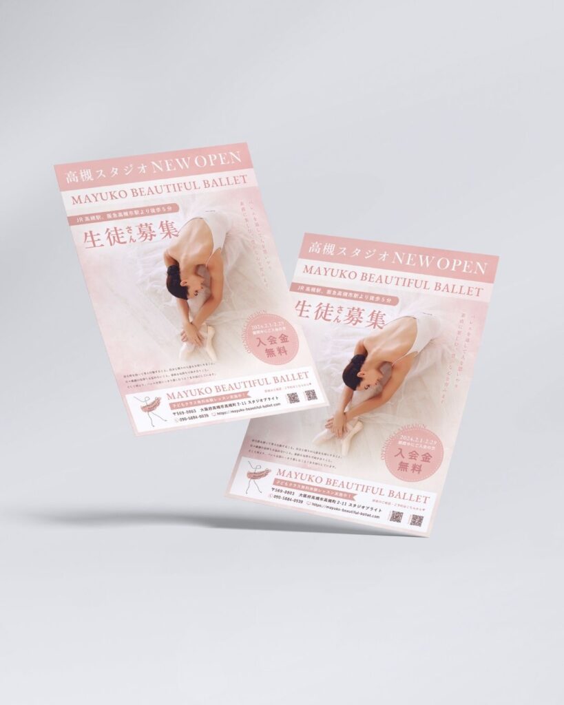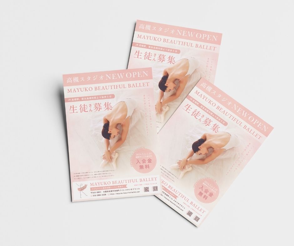 大阪の西中島南方にスタジオを構えていらっしゃるマユコビューティフルバレエ様。2024年2月に高槻でのスタジオ新設に伴って、スタジオオープンチラシの制作をお任せいただきました。