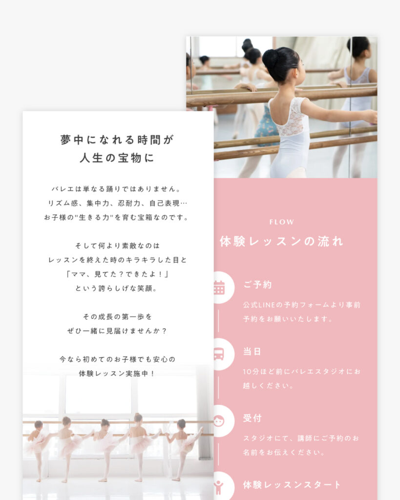 目に留まる広告ビジュアルとともに、スタジオの魅力やバレエを習うことの価値を丁寧に言語化した広告専用LP(1枚のページ)を制作します。
